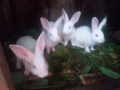 White rabbits with red eyes. White giant breed. 2 months old.